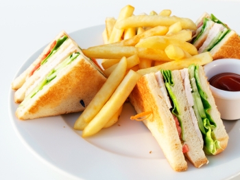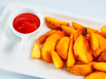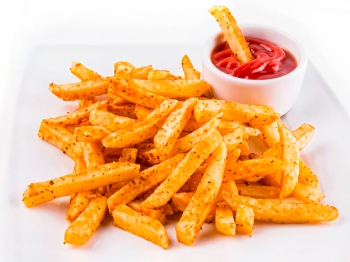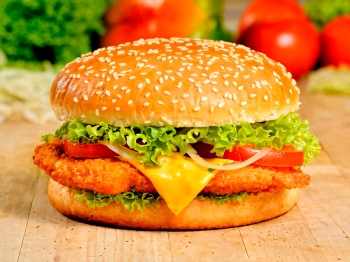 хлеб харрис, филе куриное, огурец, помидор, салат, сыр чеддер, соус гриль, соус bbq, картофель фри, кетчуп