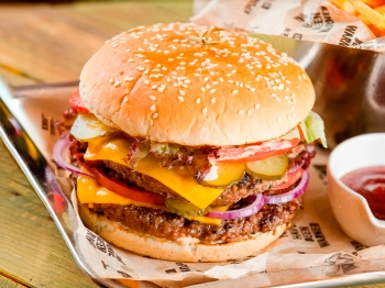 булочка, котлета говяжья, бекон, помидор, сыр чеддер, салат, огурцы маринованные, лук красный, яйцо куриное, соус bbq, соус гриль