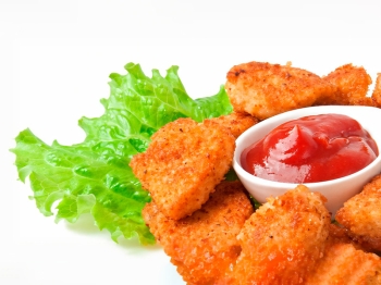 булочка, наггетсы куриные, сыр чеддер, салат, помидор, огурцы маринованные, лук, соус bbq, соус гриль