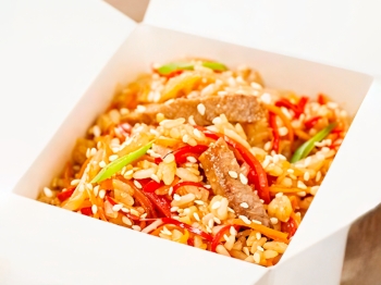свинина, рис, цукини, перец болгарский, морковь, шампиньоны, кунжут, соус сладкий чили